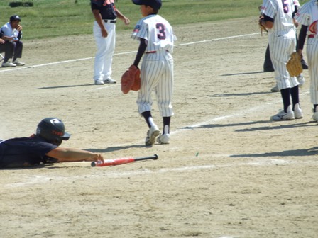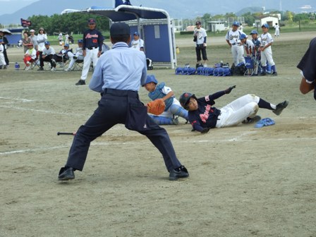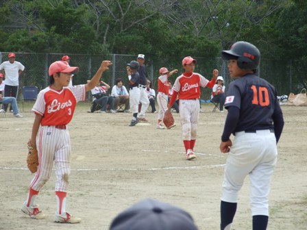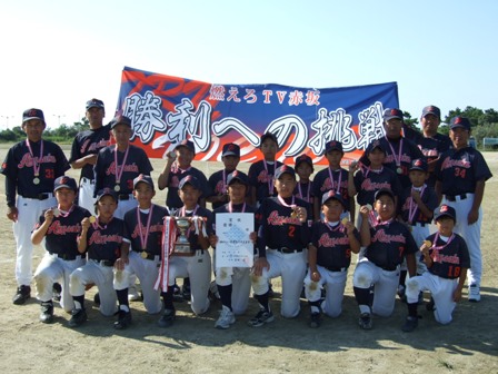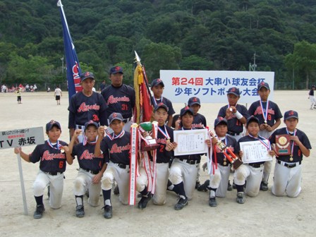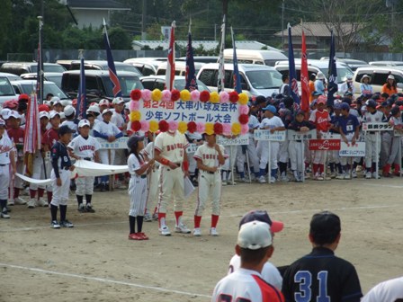 着く頃には、明るくなり朝日がまぶしいくらいでした。 そのまま、開会式の会場へ・・・そこで目にしたのは? 長旅で疲れた心を癒してくれるもの・・・特産のみかんです。 粋な計らいに、みんな大喜びでした。 開会式 福岡県勢は仲良く並んで行進です そして運命の1回戦 VS 北陽少年(長崎市)さん 先発ノン 長旅の疲れなのか・・・好投手をなかなか、打つことが出来ません ホームランで2点を先制され・・・あれよあれよと2点ビハインドのまま 時間切れ、最終回 2アウト ハウステンボスに気持ちが傾くものの ドラマがありました・・・ランナー1塁2塁としつこく攻めてバッターはノン 決めてくれました!! サヨナラの3ラン!! (本人曰く、打たれたら打ち返すという気持ちが強かったそうです。) 結果 3-2 勝利です。 ソフトボールの神様に出会えた気分でした。 2回戦 VS 星鹿少年ソフト(松浦市)さん 先発 コータ 初戦を劇的なサヨナラで、調子に乗らないわけはありません。 この試合では、全員出場!! モッチャンのホームベースを食べるようなスライディング!! コウスイのホームラン!!ソウやユウトにもヒットが出ました。 しっかりと、打ち勝ち 結果 6-0 勝利!! 3回戦 VS 西海北クラブ(西海市)さん 先発ノン 1回にノンの2ランで勢いづきました。続いてタクヤもアベックとなり こうなると、もうこっちのペースです。 結果 7-1 勝利!! 準決勝 VS 長与南少年ソフトボールクラブ(西彼杵)さん さすが強豪です、投手戦となりますが・・・ (ゆうゆうと見逃す低めの球が、全てストライクの判定にみんな戸惑い、その低めの球を打ちにいってしまいなかなかヒットになりません。あ~あ~長崎は今日も低かった~なんて歌も飛び出した) コウタのナイススライディングで1点をもぎ取ることが出来た 結果 1-0 勝利!! 決勝戦 VS 上白水ジュニアライオンズさん 同じ福岡県勢の戦いとなりました。 先日の朝日新聞社旗争奪大会を制し、波に乗っているチームです。 こちらも、投手戦となり ランナーはだすものの後1本が出ない展開 タイブレークでも決着がつかず、抽選へ・・・ 結果が出るのを息を呑んで待ちました。 結果を確認した監督の小さなガッツポーズが印象的!! やったー思わず飛び上がるほど喜びました。 みんなの頑張りが、結果となりました。 結果 抽選 5-4 勝利!! 全ての試合のじゃんけんで勝ち!!最後は抽選でも勝ち!! ソフトボールを通じて、いろんな経験をし成長し 流した汗と涙の分だけ、少しだけ何かが欲しいと思っていた・・・ 今年 いくつかの勝利はあったものの これだけのカップ戦を制したのは初めてです。・・・ 優勝旗・賞状・カップ・楯・トロフィーにメダルそしてみかん!! 有難すぎるぐらいの賞をいただきました。 これにおごれることなく、でも・・・自信を持って この力を常に出せるよう、これからもみんなで努力しよう!! TRY VICTORY 勝利への挑戦は、まだまだ続く・・・
