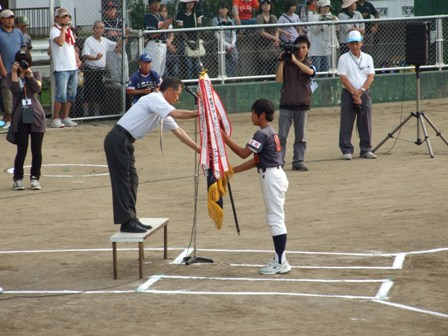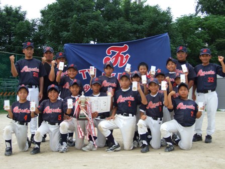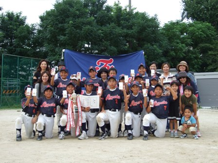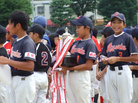 久しぶりのカップ戦優勝!! 努力が花になる 決勝は、予想通り福浜さん 過去2戦 負けて学ぶものがあった。 今日は、みんなの気持ちが一つになって勝つことが出来た。 誰がヒーロー、ではない。 一つ一つのプレー みんなで守り、みんなで攻める。 1点を取るためにそれぞれの役割があった。 やはり、勝って学ぶことの方が大きい。 いままで、足りなかったこと 勝ちたいという気持ち!! 気持ちを強く持つことで、1球1球の集中力はこんなにも変わるんだ。 2回のタイブレーク、取って取られての繰り返し 息詰まる戦い 気を抜くな!!集中!!我慢!! 勝利の瞬間、誰もが飛び上がった。 この感動 だれもが忘れていた。 決して小さい勝利ではない!! 子ども達はさらに大きくなった。 これから、さらに努力してくれるだろう この3日間、子ども達よりサポートの方が大変だったと思いますが、 疲れが吹き飛ぶような、勝利でした。 私が、TVに関わってBEST3に入るような試合内容だったと思います。 おめでとう!!